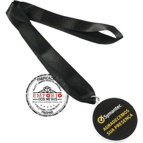 Medalha em acrílico leitoso no formato redondo gravada com impressão digital U.V., montada com fita de cetim a uma cor.